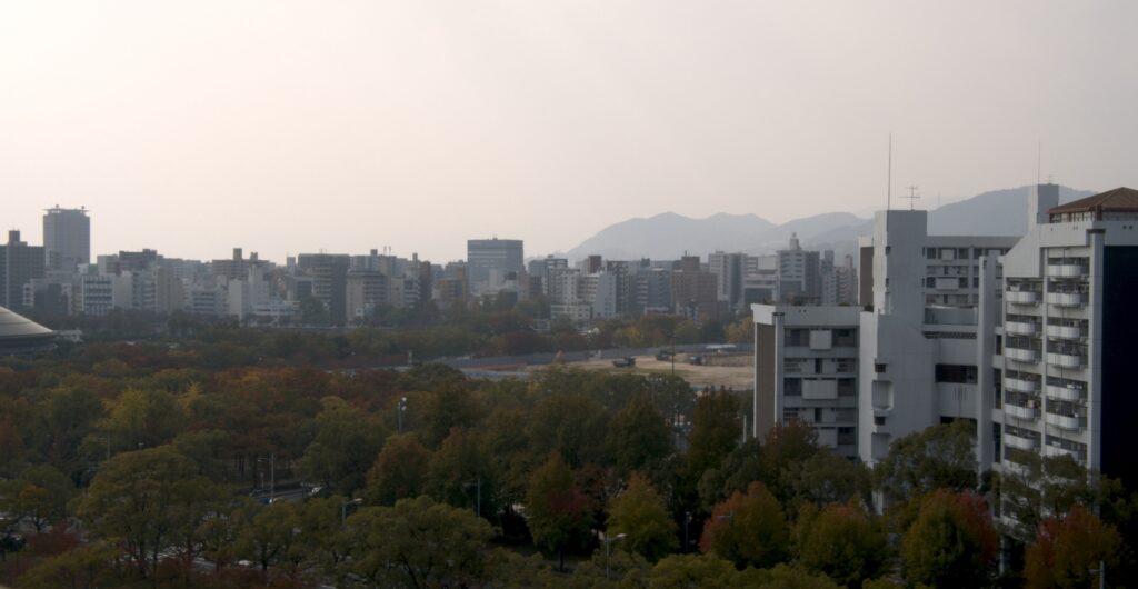 広島の街中に存在するため、周りのビルを見渡せます。